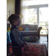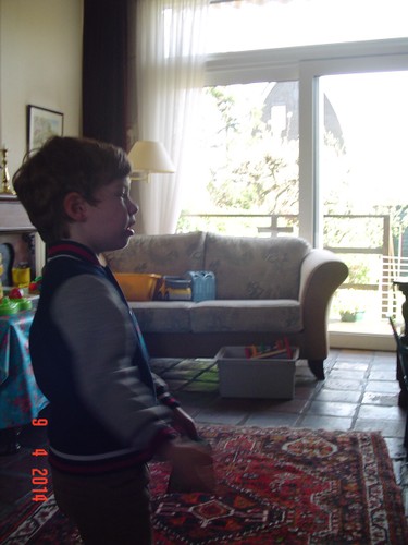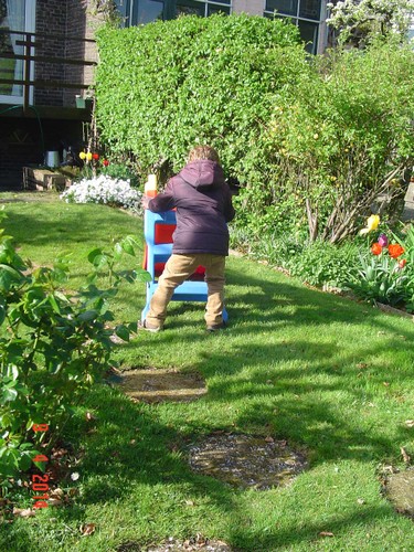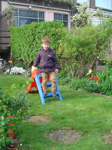 We zijn thuis, Bart rent de tuin in, kom je binnen? "Nee, ik wil een bloemetje plukken", komt dan toch maar naar de trap en dumpt vervolgens het madeliefje op het aanrecht. Op de bank MM kijken naar 'goofbot', baasje wordt weer wat rustiger en het fenomeen 'robot' wordt uitgebreid besproken. Dan eten, begint in de keuken al te schransen. In de kamer rest opeten, wel met 1000-woorden-boekje want Bart is weer schopperig. Dan: "ik wil op balkon met nieuwe waterpistool", nog even dan en ik ga opruimen. Na 10 min.: kom je tanden poetsen? "nee ik wil niet, ik wil niet komen!!", kom nou maar, het is echt tijd, "ik wil niet komen!!", Bart zet een huilstem op en parkeert zichzelf op de deurmat, "ik wil niet komen". Ineens wordt de knop omgedraaid: "doet dat spinnetje daa?" die zit daar gewoon, kom je? Baasje stapt op de stoof bij het aanrecht en veegt met een groezelig handje een traantje weg. Kijk nou, een zwarte veeg op je toet, "ik wou niet komen", precies en nou gaan we tanden poetsen. In de kamer: kom je even een schone luier aan doen? "NEE ik wil niet!", daar gaan we weer. Wilt u alstublieft even komen liggen meneer Bart? Ik sta te wachten. Hij kijkt me peilend aan, geeft dan een grote grijns en gaat liggen. Klaar, kom maar even staan, even je broek ophijsen. Bart blijft liggen, wat je wilt baas, dan ga ik even opruimen. Als ik terugkom uit de keuken ligt meneertje nog op de bank, ik ga in de stoel even wat in m'n agenda schrijven. Dan komt hij van de bank af, schuifelt met z'n broek op z'n enkels naar me toe en leunt tegen me aan. Wat is er Bart? hij zegt zachtjes: "ik kom broek ophijse", da's heel verstandig want anders loopt het zo moeilijk hè? Ga nu maar even pop en hond pakken, hij zoekt weer de confrontatie want hij smijt nu de rugzak naar me toe. Niet gooien Bart! Hij doet net of hij me niet hoort en loopt naar de boekenkast, wijst naar een klosje gouddraad: "whom ligt die wol daa?", ik kijk hem aan, "whom ligt dese bolletje wol daa?", ik geef je pas antwoord als je gewoon je pop en hond pakt, "whom ligt die bolletje wol daa?", ik kijk en zeg niks, "whom ligt die bolletje wol daa?", ik kijk, dan moet hij een beetje lachen en pakt z'n knuffels. Goed zo, die wol is voor de jurk van Liu, en dan gaan we samen naar boven. Boven zonder problemen het standaardritueel, ik hoor nog een paar keer het muziekje.