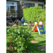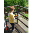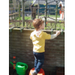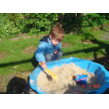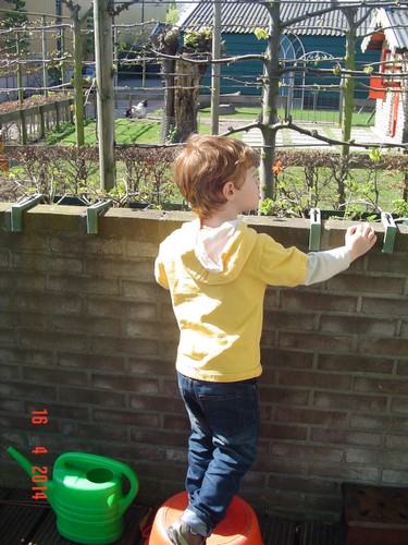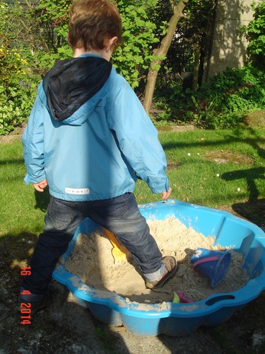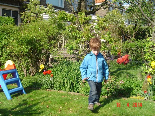 Papa staat te kijken bij het hek naar Bart's graafwerk. Dan in de tuin nog wat drinken en Bart wordt dwars: gooit steeds zand uit de zandbak en als hij standjes krijgt gaat hij uit zichzelf even in retraite bij het tuinhek. Als het te gek wordt, doen we de zandbak dicht, Bart gaat even staan simmen achter papa's fiets en komt dan weer teruglopen. Nog even kletsen en dan inpakken.