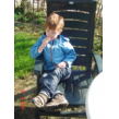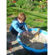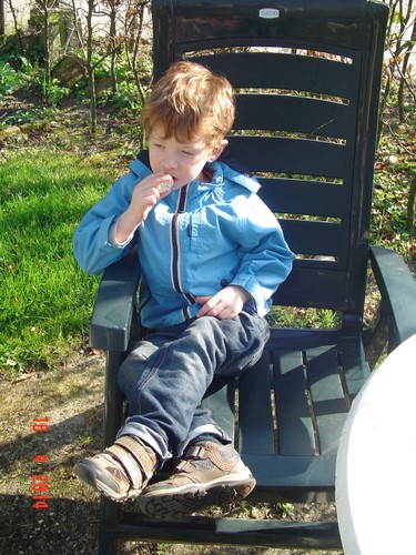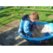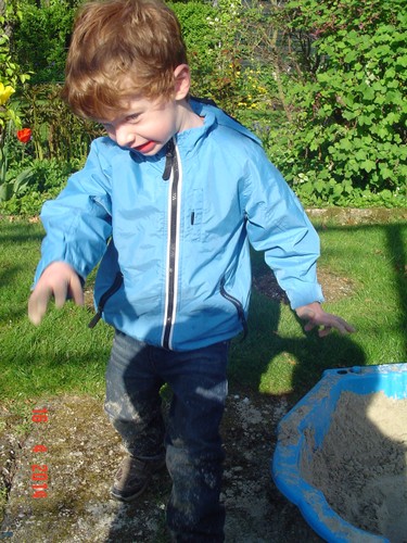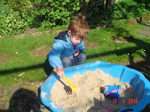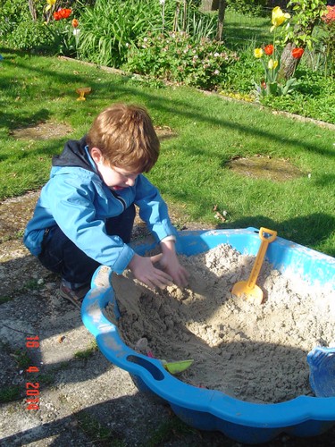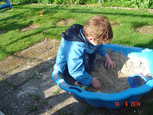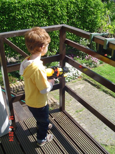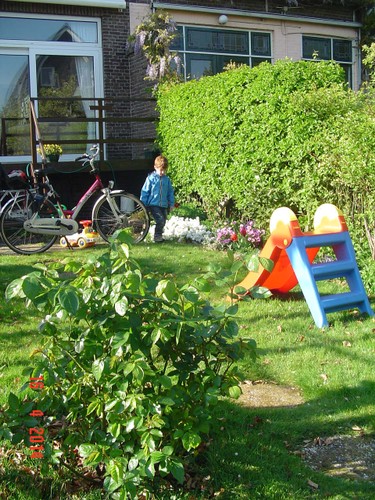 Bart slaapt nog, wordt langzaam wakker, we kletsen een beetje onder het aankleden. Beneden naast me op de bank chocomel opdrinken en koekjes knabbelen: "aanoud sing dak rrepaarreren bij buurtjes . . met vlammetjes . . hij had Karel ook meesenome . . Karel zei au (waarom?) had vinges gebrand". Hadden ze ook een laddertje? "Nee . . een grooote ladder". Drinken en koekjes op, wat wil je nu gaan doen? "Buite in de zandbak . . mijn watepistool moet ook mee naa buite" en dan is Bart druk bezig met zand, waterpistool en glijbaan, tussendoor sap drinken en nog wat koekjes eten. Dan ziet hij Meta: "ik heb nieuwe watepistool", Meta bewondert het apparaat, "ik heb nos een kadootje", wat heb je nog meer gekregen?, . een krruiwage", waar is die dan? "staat op de kast", als Meta vervolgens vraagt waarom dat is, vertelt Bart: "mama is in utrecht, cussus geve". Meta kijkt me vragend aan maar ik zeg dat ik dat later wel uitleg. Bart wil koste wat kost het gevoelige onderwerp vermijden! Meta naar binnen en Bart speelt verder, graaft kuilen, schept z'n schoenen onder het zand: "mijn schoene zijn vestopt oma".