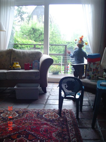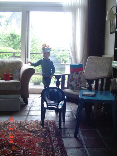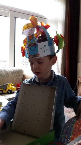 Bart wil nog een boek uit de boekenkast maar nu vind ik het tijd dat hij zelf gaat spelen, hij glijdt van de bank, doet z'n feestmuts op en dan ziet hij papa aankomen, "papa papa!!", en wordt daarna een beetje stuiterig en dwars. Het duurt even voordat hij wat kalmeert. Mannetje is duidelijk ergens mee bezig.