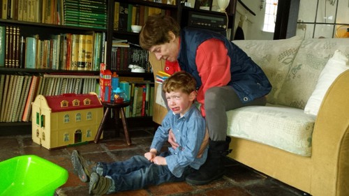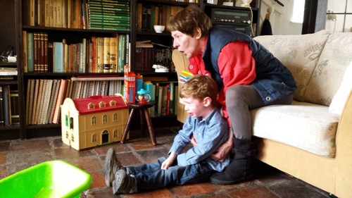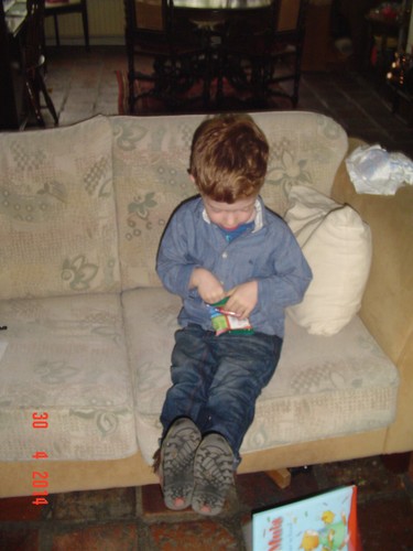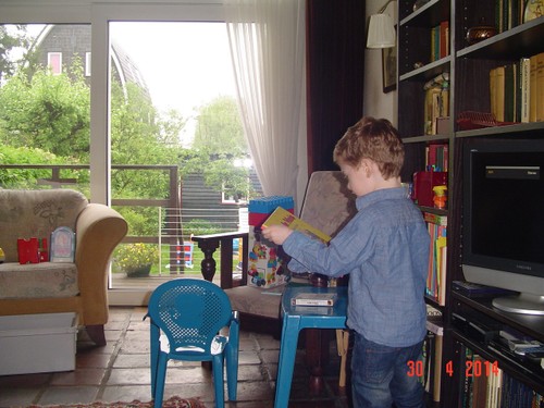 Diep in slaap en het kost moeite om hem wakker te maken. Rustig aankleden, is je luier nog droog? "jaaa!" en dat klopt. Nou dat vind ik heel knap als je aan het slapen was, dan even voor het raam naar buiten kijken en beetje kletsen. Beneden op de bank tegen me aan leunen en een paar slokjes chocomel drinken, is duidelijk nog niet helemaal wakker. Na een tijdje: "ik wil een boekje lezen" en pakt een Tip-de-Muis-boek. Is goed maar eerst je chocomel opdrinken en dan lezen we het ene muisboek na het andere. Als hij met het vierde boek komt aanzetten, vindt ik het tijd om eerst even te plassen, weer gelukt! Daarna lezen we nog 3 boeken terwijl Bart een zakje alfabetkoekjes knabbelt.