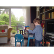 Thuis. "Ik wil mikkie mous kijke", Bart gaat met cadeautje op de bank zitten en kiest sessasiesasses van de dvd, we kijken samen. Denk je eraan dat je geen luier aanhebt? "ik ben 3, dan plas ik niet in mijn broek", OK. Afgelopen, "eve uitpakke oma", ik haal het emmertje uit het netje en Bart bewondert de inhoud, "mijn buik rommelt", ja je zult wel honger hebben, ik ga gauw brood smeren, Bart blijft op de bank zitten met z'n cadeautje. Ik loop even terug: wat wil je drinken en wat wil je op je brood? "chocomel . . en ik wil smeerkaas en smeerworst", wil je ook een toetje? "neee". Ik weer naar de keuken, even later komt Bart toch naar de keuken: "eve proeve of lekker is". De rest wordt opgegeten in de kamer onder het lezen van het berenboek. "Nu ga ik eve op balkon, eve iets pakke", parkeert loopauto voor de muur, "nog eve iets pakke", haalt uit de keuken z'n waterpistool, legt dat voor het hekje en gaat dan binnen spelen met electro.
