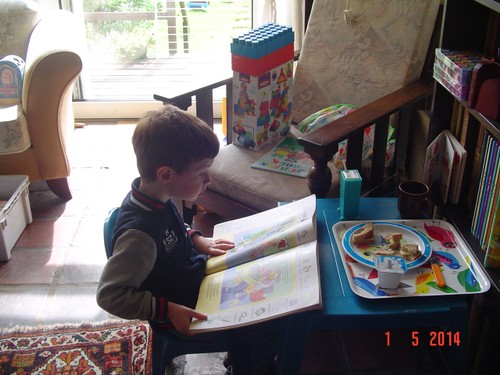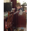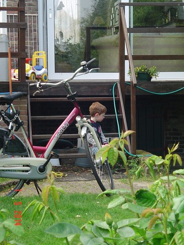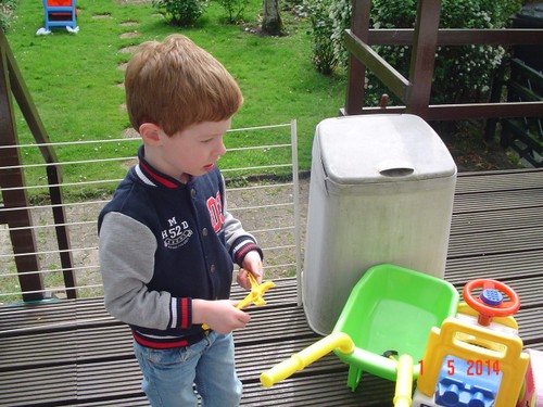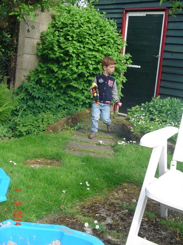Diep in slaap, wordt langzaam wakker, rustig aankleden en naar beneden, op de bank chocomel opdrinken en een paar koekjes eten, Bart leunt tegen me aan. Dan besluit hij dat hij de tuin in wil "mette traktor", wil niet naar het park. We verzamelen spullen, gaan de tuin in en pakken de tractor uit de kelder. Bart probeert even te rijden op het tuinpad, maar hij mist nog de spierkracht en de coördinatie, "lukt niet".
