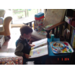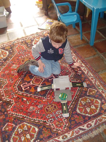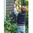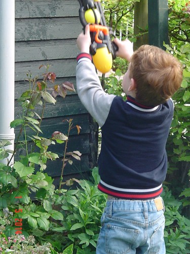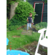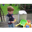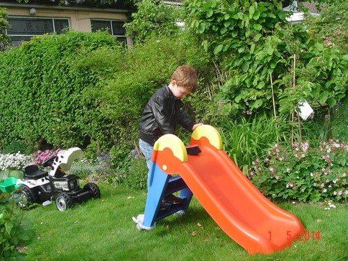 't Is ook nog wel erg zwaar, we proberen het een andere keer wel op het grote pad. Dan zeult hij het ding op het gras en gaat "motor raparere" en koppelt aanhanger af en aan. Na een tijdje verder met glijbaan (natuurlijk eerst schoonvegen), zandbak en waterpistool: "oma ik maak jou garage schoon", geweldig, dank je Bart.