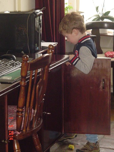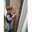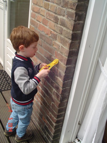 Thuis, samen MM kijken over Donald en z'n leeuwtje, Bart leeft mee met het verhaal, roept, wijst en springt af en toe op en neer. Dan gaan we brood smeren: "maa mijn buik rommelt nog niet", hoeft ook niet, als je niet eet, krijg je pijn in je buik van de honger. In de keuken verkondigt Bart: "ik ga vast aan mijn tafel zitten", KNAL-keukendeur achter zich dicht, ik roep door de deur: wat wil je drinken? "deur gaat op een kier open: "chocomel", KNAL-deur weer dicht, en wil je nog een toetje? deur gaat weer op een kier: "JAAA . . geen appel!" KNAL-deur dicht. Dan hoor ik hem in de kamer schuiven met z'n stoel, even later is hij weer terug in de keuken: "ik kom eve proeve of lekker is". Ik grijns, in de kamer verder eten en lezen van berenboek. Alles op, Bart loopt naar z'n kast, pakt z'n garage eruit, speelt er even mee en dan: "ik wil op balkon . . eve iets pakke (kruiwagen en loopauto worden op balkon gedumpt), nog eve iets pakke". Bart gaat aan de slag met gereedschap en snoertjes: "dit is oplader voor auto . . . oma kun je eve door de schuifpui lope? ik ben eve je huis aan het mooi make", ik mag dus niet de keukendeur gebruiken. Vanuit de keuken zie ik dat hij met z'n tang de muur bewerkt, oh dank je, nog even want 't is wel zo tijd om te plassen Bart! Hij zegt niets maar gaat door met z'n werk aan de muur: hameren, boren, enz.