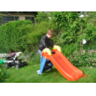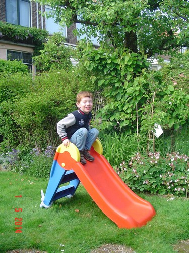 We nemen net de schade op van de door de kippen kapot getrapte plantjes als papa aankomt. We blijven nog even in de tuin zitten kletsen en dan wordt Bart weer stuiterig: gooit zand uit de zandbak op de rand, niet doen Bart!, meneertje gaat gewoon door, nog een keer waarschuwen en nog een keer. Dan is mijn geduld op en doe ik de zandbak dicht. Bart trekt zich beledigd terug op de trap, maar na een tijdje komt hij schuldbewust knuffels halen. Dan gaat hij capriolen uithalen op de glijbaan: hou je vast Bart, da's gevaarlijk, 't maakt geen indruk, integendeel, hij gaat bovenop het ding staan balanceren en kijkt ons triomfantelijk aan. Hoogste tijd om naar huis te gaan.