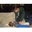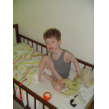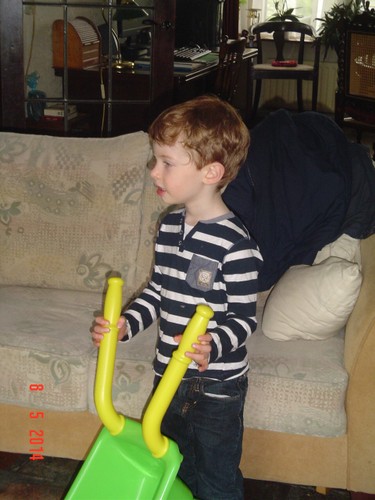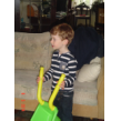 Thuis. We kijken MM en de schatzoekers, afgelopen en Bart pakt z'n kruiwagen en knalt ermee op de grond. Niet doen Bart, zo gaat-ie stuk, "moet je nieuwe kope", ja, 'k ben gek, nee hoor! "waarom?", als jij hem stuk maakt, koop ik echt geen nieuwe. Dan gaan we z'n cadeautje uitpakken, Bart pakt direkt het lange 'spekje' eruit. Da's geen spekje Bart, 't is stoepkrijt, "kan ik buite mee spele . . nu wil ik deze kleine spekje proeve", nee we gaan eerst brood eten, daarna mag je een spekje. Bart eet langzaam, drinkt weinig en leest z'n berenboek. Ineens: "oma ik moet poepe", naar de wc dus, maar na een minuutje verkondigt Bart: "lukt niet!!". Verder eten dus, baasje wrijft af en toe in z'n ogen en geeuwt. Brood op, "nu wil ik een spekje ete", eerst nog wat chocomel drinken, lukt met moeite om ½ pakje leeg te drinken, dan knabbelt hij een spekje en speelt met hamerbank. Weer ineens: "oma ik moet poepe", nog een keer naar de wc, ik doe de deur op een kier. roep maar als je klaar bent en ik wacht in de kamer. Al snel hoor ik hem triomfantelijk roepen: "OMADIEN OMADIEN!! Is gelukt!" Bart staat op de stoof in de pot te kijken: "kijk oma! is een grote", hij heeft een enorme bolus geproduceerd. Nou geweldig, heeel groot, en mooi rond en mooi bruin en hij stinkt ook goed. Samen staan we even bewonderend te kijken, dan billen schoonmaken: "mijn billen doen au", zijn inderdaad een beetje rood, eerst maar doortrekken (pfff), dag poepie - lekker zwemmen. Dan naar de bank goed schoonmaken met billendoekjes en sudo erop, gelijk maar een broekluier aan. Even handen wassen dan gaan we gelijk maar tanden poetsen: "maar ik ben niet moe", nou dat denk ik wel, ik heb je zien geeuwen. Geen protest verder en met knuffels in kruiwagen naar boven. Bart houdt m'n been weer vast als ik het raam dicht doe en dan kruipt hij er lekker onder.