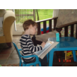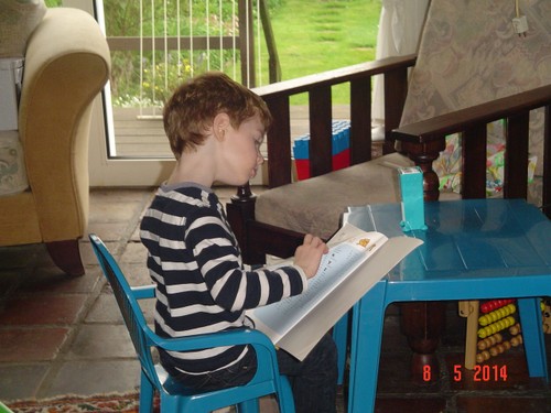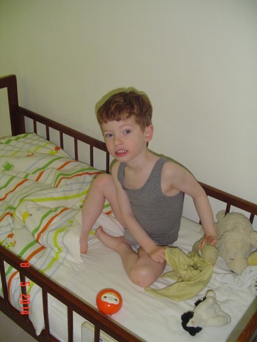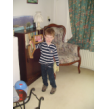 Bart ligt nog maar gaat gelijk zitten, was je al wakker? "ja", moest je me niet roepen dan?, "nee". Zit nog een beetje dizzy bij te komen en dan gaan we aankleden, broekluier is nog droog, knap hoor dat je dat kunt als je slaapt! Even voor het raam kijken en: "ik wil weer eve deze kamer kijke, jouw kamer". Foto's etc. worden bekeken en ik moet uitleggen: "is oud huis, waarom hangt die daa? . . is dat? . . . . doet-ie?" Dan naar beneden en chocomel opdrinken, moet je nog plassen? "Nee", zeker weten? we gaan zo even naar de dierenwinkel, "nee plas komt niet". Dus jassen aan en in de regen naar hofstede, eerst beesten en vissen kijken en dan door de plantenafdeling. Daar rent Bart heen en weer tussen de rekken met planten waardoor ik hem soms niet zie, alleen kan horen en dat vind ik eng, snel naar de volgende afdeling dus. Daar laden we tuinaarde op de kar en kiezen een grasschaar uit, naar de kassa rijdt Bart mee op de kar, gauw zakken in de auto laden en naar huis. Het plenst inmiddels en het waait hard, op het balkon: "ik word nat", is maar een beetje, droogt zo op. In de keuken bekijken we de grasschaar, ik probeer ermee te knippen, maar dat lukt niet, "dit knopje oma" wijst Bart, heb ik geprobeerd maar het zit vast, "moet je harder doen", zowaar dat lukt, wijsneus had gelijk. Dan in de kamer wat water drinken en koekjes eten, ik zet alvast de tv aan voor sesamstraat.