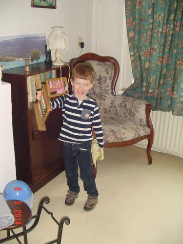 Bart ziet me aankomen en rent naar de voordeur, daar staat hij me grijnzend op te wachten. In het lokaal pakt Linda nog 2 cadeuatjes: 1 voor moederdag en 1 uitdeelzakje, volgens juf gaat het goed met plassen, Bart gaat zelf naar de wc! Jas aan en tas pakken, in de gang bij de voordeur komen de kleinste zeesterren terug van gym, Bart aait over ieder bolletje: "daaag-daaag", dag Bart. We lopen naar de auto, Bart houdt z'n moederdagcadeau stevig vast. Bij de auto wil hij zelf het voorportier opendoen en voorzichtig legt hij z'n cadeautje op de bijrijdersstoel, z'n eigen cadeautje legt hij naast z'n eigen stoel. Onderweg: "fantastisch . . zitten spekjes in mijn cadeautje oma", oh lekker, kun je thuis openmaken en eten, "nee oma, eentje maar, anders is alles op als ik thuis ben . . . zit lang spekje in zie je dat?", nee ik moet op de stoplichten letten, "ik doe mijn vinger in het zakje, hoor je dat oma?", ja ik hoor het ritselen. Dan zingt hij een beetje vals: "en een trommel en een fluit".