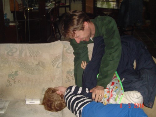 Maar daar is papa al, op de fiets. We zitten nog even wat te praten, Bart staat voor z'n kast om elektro eruit te halen en dan: "ik heb natte broek", oh-oh, heb je geplast? "jaaa", was je vergeten dat je geen luier aan hebt? "jaaa vergete", tja kan gebeuren, gauw verschonen maar, eerst nog even naar de wc kijken of er nog meer komt. Bart loopt wijdbeens in z'n natte broek achter me aan, ja da's niet lekker hè zo'n natte broek. Op de wc trek ik alvast z'n natte spullen uit, " 't is niet anders", nee, maar 't kan wel anders, " 't is niet anders", een plas komt niet meer. Droge kleren aan en nog even spelen, baasje wordt weer wat stuiterig en als papa achter de bank een monster nadoet, vindt hij dat ineens een beetje "eng". Ik fluister: kom we gaan naar het monster sluipen en dan gaan we hem heeeel hard kietelen. Sneeky-creepy sluipen we achter 'het monster' dat natuurlijk niks in de gaten heeft en dan springt Bart juichend op z'n rug. Het monster schrikt en valt om, Bart heeft gewonnen! Dan is het tijd om in te pakken. Het regent nog steeds maar verdorie, Bart's regenpak zit niet in de tas. Dan maar de verfjas eroverheen en een vuilniszak over z'n benen.
