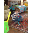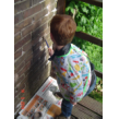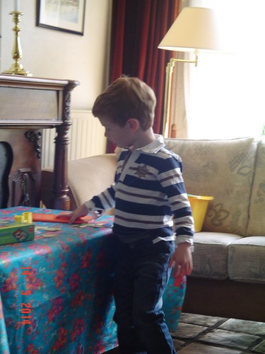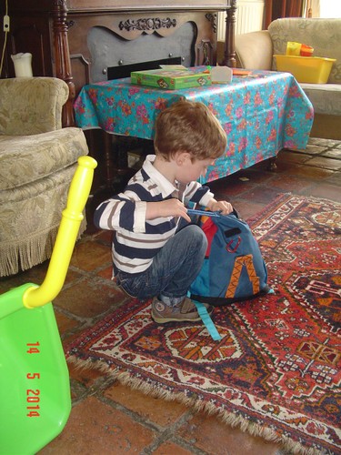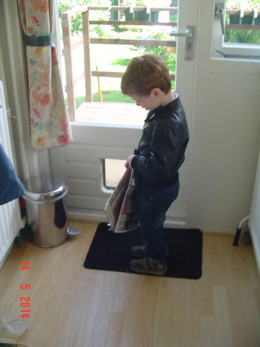 Thuis, gelijk maar brood smeren, wat wil je op je brood? "hagelslag", dat heb ik niet, "smeerworst en plakje kaas", halverwege: "ik moet plassen", grote plas op de wc en verder smeren. Eten en alles op, "nu wil ik mikkie mous kijke, sessassiesasses", en doet weer enthousiast mee. Daarna nog heel even spelen, dan knuffels mee en naar boven. Ik hoor hem nog een tijdje zachtjes rommelen.