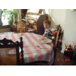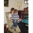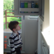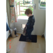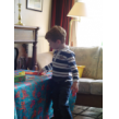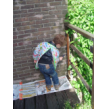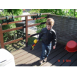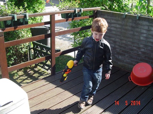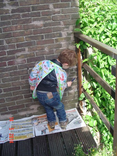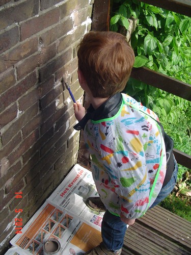 Slaapt nog en het duurt een tijdje voordat hij weer bij de tijd is. Beneden op de bank rustig chocomel opdrinken en babbelen. Dan gaan we aan de slag: de gedichte gaten van de balkonmuren verven, Bart met verfjas aan en met z'n eigen kwast. Hij vindt het prachtig: "ik ben hard aan het werk . . . dit is mijn klus . . . is hard werke zeg . . . deze is ook mijn klus . . . ik ben hard aan het werk . . ". Als alle plekken geverfd zijn, gaan we opruimen en kwasten schoonmaken. "Nu wil ik nog eve waterpistole" en dan: "nou wil ik in de tuin werke", nee daar is het nu te laat voor, eerst nog even wat sap drinken en dan gaan we eten koken. Op de bank drinkt Bart z'n sap en ondertussen kijken we sesamstraat. Als de pesterige angsthaas te zien is, springt Bart op schoot en klemt zich aan me vast, hij vindt het schepsel met het agressieve stemmetje maar eng. 't Loopt gelukkig goed af en we bespreken even waarom de haas geen appel kreeg, net goed voor het stoute beest! Dan naar de keuken eten klaar maken. Bart knabbelt een stukje komkommer en kletst weer honderduit, ineens: "ik moet poepe", naar de wc dus, even later: "oma oma!!! ik heb twee gemaakt!!". Er ligt een prachtig product in 2 stukken, wat een mooie!! "Mijn bille doen pijn", ja dat kan ik me voorstellen, op de bank dus verder schoonmaken en sudo erop. Dan nog even tafel dekken en een toetje maken.