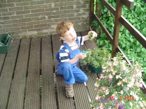 Thuis, in de keuken houdt Bart z'n been boven de poezemand: "kijkes poes, ik heb een bokbroek, mooi hè? (poes mauwt liefjes) Frodo vindt mijn broek mooi (o ja?) ja dat zei ze". In de kamer: "ik wil sessasiesasses kijke (wil je niet een andere aflevering?) NEEE dese, sessasiesasses!!" De dvd start op en ik zoek alvast iets met lange mouwen in de tas, maar dat t-shirt wil Bart niet meer aan, "heb het niet koud". OK. Samen kijken we weer naar de musicerende striphelden, Bart doet enthousiast mee maar doet ook af en toe z'n handen op z'n oren: "ik heb pijn in m'n ore", heeft hoge thorax-ademhaling, ik hoor hem piepen en hij hoest regelmatig. Dvd afgelopen, eerst maar even een puf, weer een hoestbui, dan brood smeren, "maar ik heb geen honger", je moet toch eten anders kun je geen hoestdrank nemen, "ik heb dorst". In de keuken eerst maar wat chocomel drinken en dan brood smeren, plakje leerdammer proeven, "ja lekker" en kiest 'cars-toetje'. Bijna 2 boterhammen op + toet + bakje druifjes. Dan op balkon weer 'snoeien' met z'n schaartje, even later:"ik moet plasse", grote plas op de wc. Weer een tijdje later: "ik heb dorst (drink je chocomel maar even op) nee ik wil lekker water drinke". Drinkt een halve beker water en snoeit weer verder.