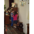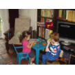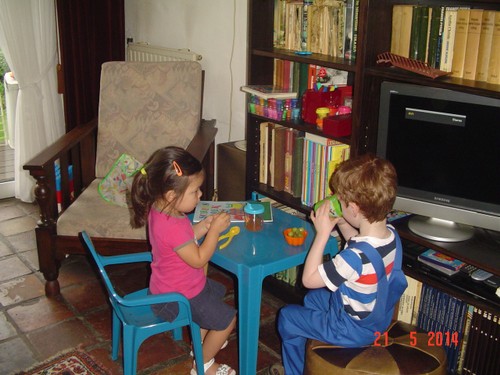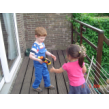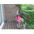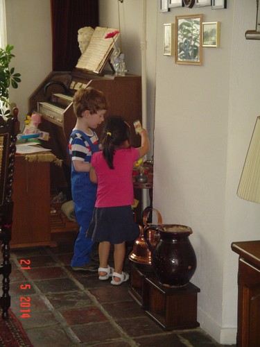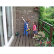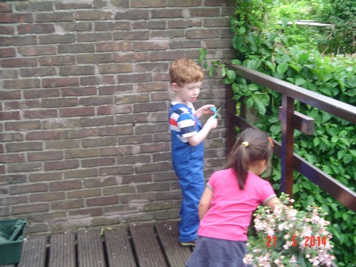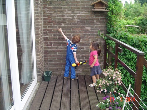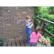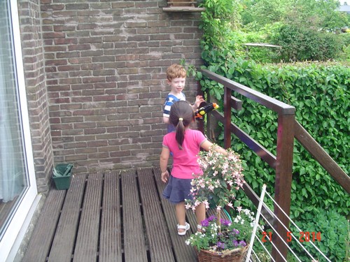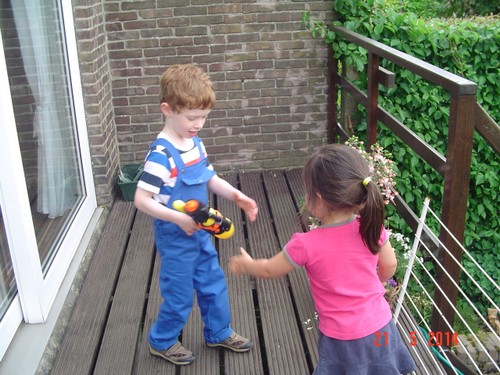 Dewi en Liu zijn er al. Door Liu's schelle stemmetje gaan we eerst maar even op het balkon zitten. Na een kwartiertje ga ik toch maar boven kijken en ja hoor! Bart zit rechtop in z'n bed: "ik wist niet wat voor geluid het was". Waarom heb je me niet geroepen? "ik wist niet wat het was". Ach ach, dat was Liu, kom maar gauw aankleden. Beneden kruipt Bart direct naast me op de bank en duwt z'n toet tegen me aan, blijft ook zo als Liu hem een cadeautje geeft, baas geeft geen sjoege! Is natuurlijk ook moeilijk, zo'n indringer in je territorium die aan jouw spullen zit. Samen pakken we dan maar het pakje uit: een batikbloes, nog een beetje groot dus later vertelt Bart aan mama dat hij een "jurk" heeft gekregen. Na een kwartiertje stel ik voor dat hij Liu even moet laten zien hoe z'n waterpistool werkt omdat ze nog een beetje te klein is om te snappen hoe dat ding werkt. Da's niet tegen dovemansoren gezegd, Bart springt van de bank en spurt naar het balkon, ineens is hij de grote meneer die wel eens even zal vertellen hoe de wereld in elkaar zit. Liu mag het dan ook even proberen maar niet te lang, ze kan er inderdaad nog niet mee spuiten dus Bart 'redt' z'n pistool gauw. Dan doet hij voor hoe je moet 'snoeien', gelukkig mag Liu nog geen schaartje vasthouden van tante Dewi dus da's makkelijk scoren. Weer binnen gaan ze samen verder: heen en weer rennen, gillen (tot wij dat verbieden), koken met pannetjes. Ze rennen achter elkaar aan, Liu is totaal niet onder de indruk van Bart's verbale en fysieke overwicht, dus baasje probeert van alles om dat overwicht te bewijzen: staan op de stoof terwijl hij zwaait met z'n gereedschap (helpt niet, Liu is totaal niet geïnteresseerd in een tang), nog een poging: "kijk Liu ik heb een bob-de-bouwer-broek", Liu reageert niet, gooien met de grote bal in de gang, het interesseert Liu niet dat ze niet zo goed kan gooien, dus terug in de kamer, even zitten aan hun tafel en wat drinken, Bart kiest z'n grote poo-beker om te laten zien dat hij geen tuitbeker meer hoeft zoals Liu. Ook nog wat druifjes eten, pffff, rust. Dan ontdekken ze verstoppen achter het gordijn, veel gegiechel, gordijn open: "kiekeboe" gordijn dicht, bis-bis-bis, maar dan is er wat commotie achter het gordijn en tante Dewi zegt: je mag niet duwen Bart! Verontwaardigd komt Bart voor tante Dewi staan en meldt: "Liu duwde mij eerst!!!" Liu komt poolshoogte nemen en gaat naast Bart staan, tante Dewi: en Liu mag ook niet duwen, jullie allebei niet. Liu kijkt onverstoorbaar en duikt weer achter het gordijn. Bart is beledigd en kom even naast me op de bank zitten maar als Liu steeds weer kiekeboe roept, is de verleiding te groot en duikt hij ook weer achter het gordijn, weer grote pret vooral als tante Dewi ze gaat 'grijpen' in het gordijn: gejuich.