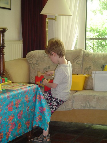 Thuis direct eten want: "ik heb honger", MM kijken en dan nog even binnen spelen met hamerbank en apparaat. Houdt dan apparaat omhoog: "oma ik speel hier niet meer mee, . . dan kunnen we die naar de zolder brengen . . en dan kunnen we de knikkerbaan mee terug nemen". Bart houdt van argumenteren. Een andere keer, we gaan nu eerst buiten de tuin met de trekker rijden, of wil je dat niet? "JAAAA!"