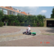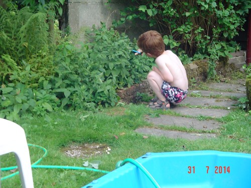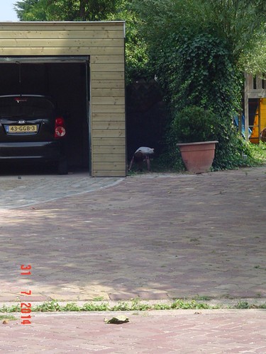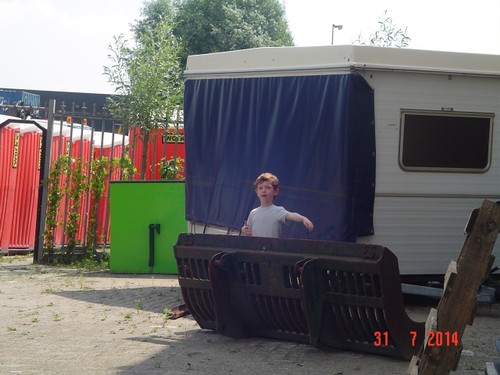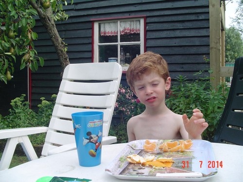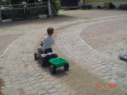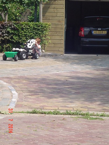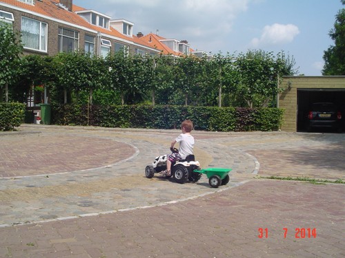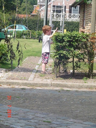 Bart haalt de trekker uit de tuin en rijdt hem het pad op. Gister heb ik een bamboestok op het pad naast de heg gezet, daar mag hij niet voorbij, dus nu even een dilemma: "ik mag hier niet rijden oma", alleen als je de trekker uit de tuin haalt of er weer in zet. Duidelijk. Crosst heen en weer, regelmatig olie controleren, af en toe trekker parkeren en verder op onderzoek: het 'donkere paadje' en de grote graver. Komt regelmatig even naast me op de biels zitten kletsen, lekker in de schaduw. Dan wil hij bij de kippen kijken, ik doe voor hoe hij dan eerst links en rechts moet kijken of er een auto van de buren aankomt en eerst luisteren. Bart volgt nauwgezet de instructies: eerst hand achter z'n oor, dan links en rechts kijken: "komt niks", goed zo!