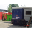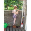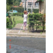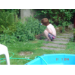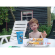 Trekker weer in de tuin parkeren en op balkon even fristi drinken, koekjes en een ijsje eten. Dan naar de plantenwinkel, we zoeken plantjes uit en Bart bekijkt konijnen, cavia's en parkieten. Tegen de kassière: "kippen hebben alle plantjes van omadien kapot gepikt, . . en nou gaan we nieuwe in de tuin doen, . . . . want kippen zijn naar de boerderij gebracht". 't Is rustig in de winkel dus de mevrouw heeft alle tijd voor Bart. Dan alles in de auto laden, "heet zeg", auto heeft in de zon gestaan, druppels staan op z'n bovenlip. En dan gaat ook nog de wijkerbrug vlak voor onze neus dicht, er moet een poenig plezierjacht door. Thuis gauw weer wat drinken en koekjes eten, dan t-shirt uit, veel te heet, en insmeren: "mama doet geen poefjes op haar handen", ik wel, dat vind ik makkelijk. Bart speelt verder met blaaspijp en water/bezem op balkon.