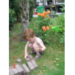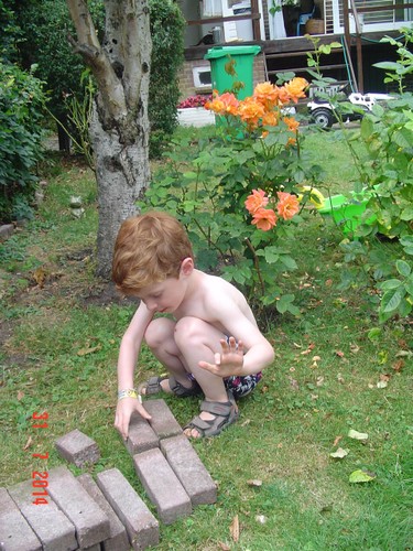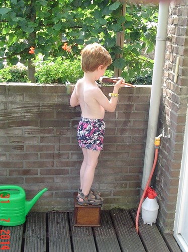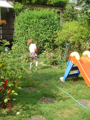 We zijn afgekoeld, dus de tuin in, er is meer schaduw en het waait een beetje. We gaan de plantjes poten en Bart geeft ze water met de tuinslang. Ineens zie ik dat z'n schoenen verkeerd omzitten, hoe kan dat nou? "Zat zand in mijn schoenen", aha, en er zelf uitgehaald. We oefenen even hoe de schoenen aan moeten, letters en klitteband bij je kleine teen. Daarna haal ik nog wat onkruid weg terwijl Bart met de grotemensenhark werkt, snoeit met z'n schaartje en werkt aan z'n 'brug'. Dan weer even pauze, Bart drinkt wat, eet koekjes en een mandarijn.
