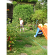 Papa is er, ziet ons en komt naast me op de biels zitten. Bart crosst en scharrelt rond. Demonstreert het 'oversteken' naar de kippen. Dan de tuin in, Bart zeult z'n trekker de tuin in, goed voor z'n motoriek. Papa drinkt wat, Bart snoeit met z'n schaar, wil dan stoeien en wordt een beetje recalcitrant. Hoogste tijd, eerst trekker in de kelder parkeren + de skippybal, Bart zeult en manoeuvreert weer en dat gaat prima! Dan binnen spullen pakken, baas is moe.
