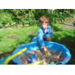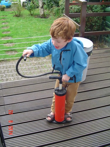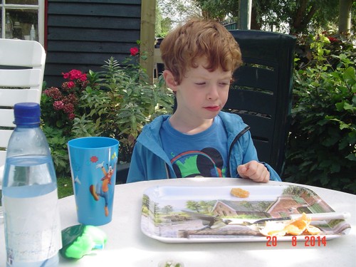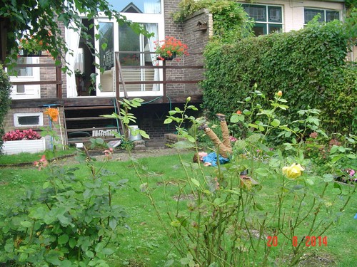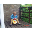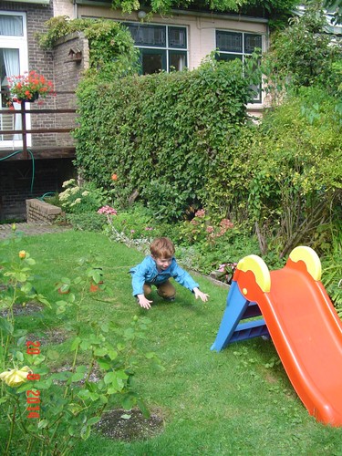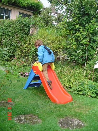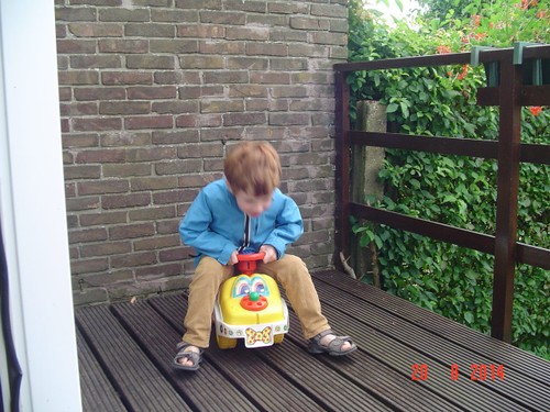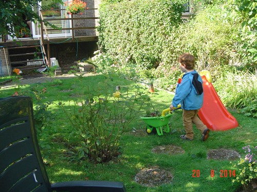 Thuis, eerst MM kijken, dan wat eten en drinken, Bart kiest 'spongebob'-koekjes en yogho en we kletsen wat: we moeten peren en appels plukken en de heg snoeien. Voordat we de tuin in gaan, kijken we toch eerst maar even op buienradar: over een uurtje gaat het regenen. In de tuin gaan we plukken: peren zijn inmiddels allemaal aangegeten door kauwtjes, appels legt Bart op de tuintafel: "als het gaat regenen, kan ik de appels in mijn winkeltje doen". Dan even zand in de zandbak omscheppen zodat het goed droogt, verder springen en de glijbaan op en af: "zag je dat oma? ik ben hard aan het werk!". De lucht wordt ineens erg grijs, kom Bart we gaan naar binnen voordat we nat worden: "eerst nog even de pomp uit de kelder halen". Bart duikt de donkere kelder in: "en de skippybal", pomp krijg ik in m'n handen en skippybal wordt de tuin in gegooid. Dan gaan we naar binnen. Het is nog steeds droog dus Bart probeert vol overgave z'n pomp uit op het balkon. Dan gaat hij nog even racen op z'n loopauto om tegen de muren te 'botsen'. Denk erom dat je niet met je hoofd tegen de muur knalt!! "Natuurlijk doe ik dat niet, zag je hoe ik goed remde oma?" Geweldig!