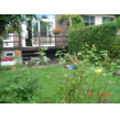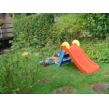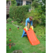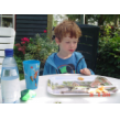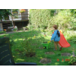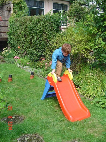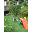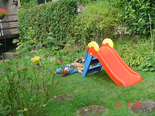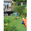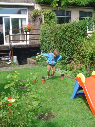 Even koekjes eten en yogho opdrinken, dan gaan we de tuin weer in en ga ik de heg snoeien. Bart harkt even takken bij elkaar, gooit wat in de kit en gaat dan springen en weer op en af de glijbaan, rolt na het springen in het gras: "zag je dat oma? zag je hoe ver?". Ondertussen ben ik aan het mopperen, pfff, wat een rotklus, takken zijn dik en Bart vindt dat ik "wild knip". Ja maar 't is ook een zwaar karwei Bart: "komt omdat je al oud bent, dan wordt je een beetje moe", en dat alles tussen z'n sprongen door! Na een tijdje zijn we allebei toe aan een pauze, Bart springt steeds tegen het touwtje aan, hoest ook regelmatig. Even mandarijn eten en wat sap drinken, dan is hij toch niet meer te houden en begint weer te springen en te klimmen en rolt over het gras: "kijk-es oma, zie je dat, zie je dat?". Na een tijdje springt hij toch iedere keer weer tegen het touwtje aan, ik help hem een paar keer om de hoogspring-installatie weer op te bouwen maar dan vind ik het genoeg: je benen zijn te moe Bart, even wat drinken. We pauzeren weer even, kletsen wat en dan snoei ik de heg af. Bart wil z'n kruiwagen uit de kamer en laadt er de takken in, niet te dichtbij de snoeischaar Bart!!!