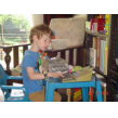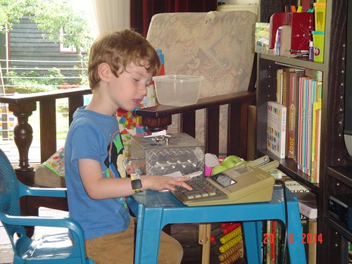 Eerst een bakje druifjes eten en kletsen: "als het regent, kunnen we op zolder de kassa zoeken (en verder hoopvol:) plantjes zijn nog een beetje droog, dat zag ik, kunnen nog wel wat regen gebruiken". Ik had vorige week nl. beloofd dat we de 'kassa' zouden zoeken als het regende. Nou ik vind dat alles nat genoeg is, Bart kijkt teleleurgesteld, dan begint het een beetje te druppelen. Dus druifjes op en naar de zolder, 'kassa' is gauw gevonden, dan pakken we nog even wat verjaard geld uit de kamer van oom Bart en doen dat er in. Baas wil nog even spelen met de knikkerbaan en we oefenen het tellen van de knikkers voordat we naar beneden gaan. Op z'n tafel maken we een winkel, ik pak nog even de oude telmachine en sluit die aan, dan ga ik boodschappen doen in de 'winkel'. Ik betaal met een pinpas (die in de gleuf van de telmachine past), vervolgens neemt Bart de pinpas weer in, bergt hem secuur op in z'n kassa en geeft me geld terug. Dan wil ik een bonnetje als bewijs dat ik betaald heb, en graag met een kruis erop. Bart pakt een memoblaadje en probeert een rondje en een kruis te tekenen met een rode viltstift, Dank u meneer! Verder met boodschappen doen. Bart is druk bezig met de telmachine, er zitten allemaal knopjes op en er verschijnen steeds andere cijfers op het display. Mijn uitleg over de knopjes negeert hij: het ratelende geluid en de verschillende cijfers die hij intoetst op het schermpje zijn veel leuker. Buiten is het inmiddels droog en er is blauwe lucht te zien.