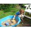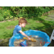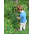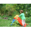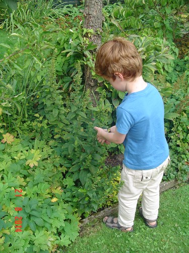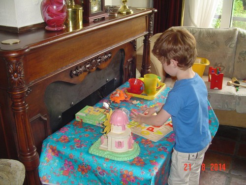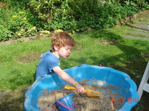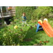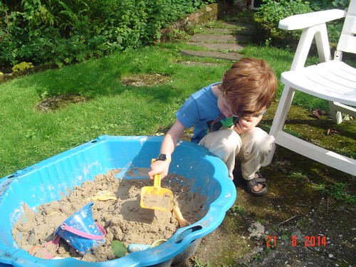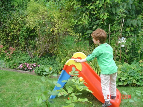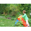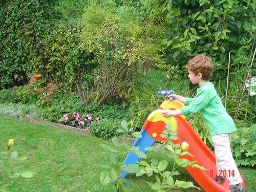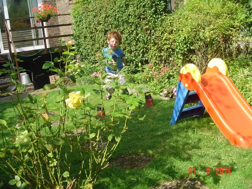 De tuin in, eerst zandbak open en zand omscheppen om te drogen, dan gaan we gras maaien. We duiken de kelder in: "ik maak de deur wel open . . moet je de strimmer niet mee?" Nee, niet nodig, de rest kan wel met de graaschaar, "dan moet je mijn schaar ook pakken". Bart helpt fanatiek mee met maaien. Klaar, grasmaaier schoonkrabben, "ik help jou oma", Bart pakt ook een krabber en samen schrapen we dat het een lieve lust is, "hier ook nog oma", nee hoor zo is het wel genoeg, dat zit teveel aangekoekt. Even pauze, Bart drinkt een paar slokjes sap en : "kijk oma, we hebben zonnebloemen gepland . daar", ze lijken net zonnebloemen maar het zijn dahlia's. Dan gaat baas hoogspringen en ver springen, rent het korte rondje van de hindernisbaan en verder in de zandbak: "ik maak een kasteel, maak ik heel hoog". Dan kanten knippen, Bart knipt hier en daar een grasspriet, maar uitgebloeide bloemen is leuker, dat is dus zijn taak. Weer pauze, sap opdrinken en half zakje alfabetkoekjes: "deze bewaar ik voor morgen", morgen ben je thuis bij mama, wat is het morgen? "Weet ik niet", wanneer komt papa thuis? "Vrijdag", en dat is morgen, dus wat is het morgen? "Vrijdag", precies. We oefenen nog even de dagen van de week maar dat is eigenlijk nog te moeilijk. Bart gaat weer springen, als hij ziet dat ik verder onkruid onder de heg vandaan haal, wil hij zijn kruiwagen "en mijn pistool", onkruid wordt even in de kruiwagen geladen en in de bak gedumpt maar dan gaat hij schieten met z'n pistool vanaf de glijbaan. Recht vooruit schieten Bart, als een balletje in de planten belandt, ben je hem misschien kwijt, "nee hoor, dat doe ik niet" met z'n 'bob'-stem. Vervolgens belandt een balletje toch in de dichtbegroeide border, tja nou moet je zoeken. "Ik heb hem, kijk oma!", triomfantelijk!