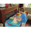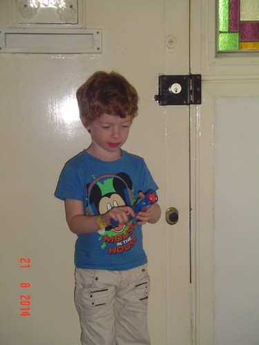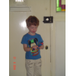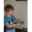 Bart rent al naar de deur voordat ik heb gebeld. Gauw jas aan en naar de auto, onderweg geeft hij z'n gebruikelijke commentaar. Thuis wil hij eerst met de kassa spelen en dan een boekje lezen: "1 boekje maar oma". Tip-boek natuurlijk, deze keer weer over de tandarts. "Ik kreeg een fluitje van de tandarts . . papa had het fluitje van Linda afgeknipt . . want het papiertje was kapot . .toen deed-ie het weer . . maar toen kon ik het fluitje van Linda niet meer vinden . . was weg . . toen kreeg ik een nieuwe van de tandarts . . nou wil ik mikkie mous kijken, mag dat oma?". We kijken samen op de bank naar de schatgravers, daarna sponge-bob-koekjes eten en sap drinken. Baasje heeft niet veel dorst: "deze drink ik straks verder". Dan spelen: zelf de letterpuzzel maken: "waar hoort deze oma?", goed kijken, dan weet je het vanzelf. Bijna nonchalant zet hij de puzzel in elkaar: "kijk oma!!!" zie je nou wel hoe goed je dat kan? Geweldig knap.