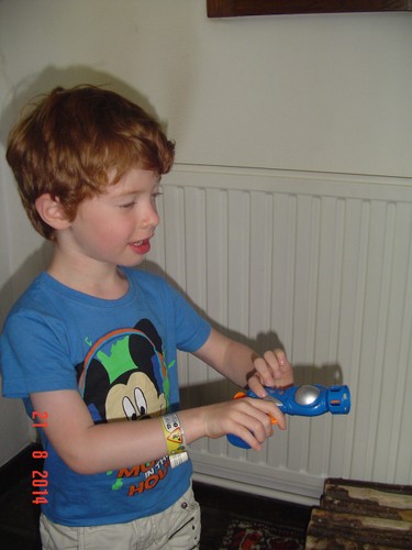 Even boodschapjes doen. Ik rij naar de parkeergarage: "hier moet je betalen", nee hoeft niet meer, is gratis, "wom?", weet ik niet, we hoeven alleen maar een parkeerkaart neer te leggen. Bij Zeeman ligt een deel van de winkel overhoop, wordt klaar gemaakt voor volgende seizoen, beetje rommeltje, maar Bart vindt al gauw iets leuks: "deze oma, deze wil ik": een balletjes pistool. Wil je geen pijltjespistool? "Nee deze met de kleurtjesballen". Ik kan het niet laten: van 1 € ga ik niet failliet. Dan zoek ik nog even verder, maar kan niet vinden wat ik hebben wil. "Ben je al klaar oma?" ja zo, nog even hier kijken, nee hebben ze niet: "dan gaan we betalen". Even bij de draaimolen naast de winkel kijken: defect: "hangt briefje op", klopt hij is kapot. Nog even naar het kruidvat maar daar is de wanorde zo mogelijk nog groter, gauw pakken wat ik nodig heb en afrekenen, Bart klemt z'n pistool nog steeds stevig vast. Weer buiten wil Bart in de helicopter naast de winkel, ook daarop hangt een briefje met 'defect'. Wat een zootje! "Geeft niet, ik kan er toch in gaan zitten en sturen". Bart duwt z'n pistool in m'n handen en klimt in het apparaat, duwt een tijdje aan handels en trekt aan knoppen. Dan terug naar de auto.