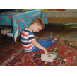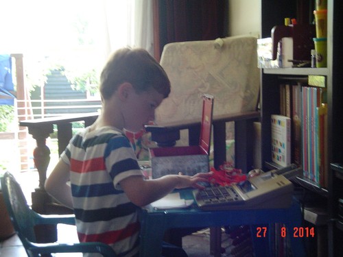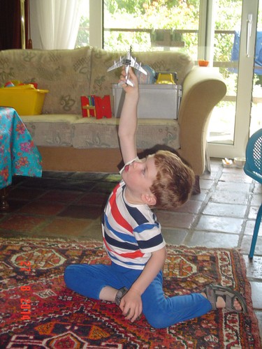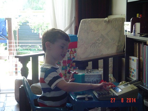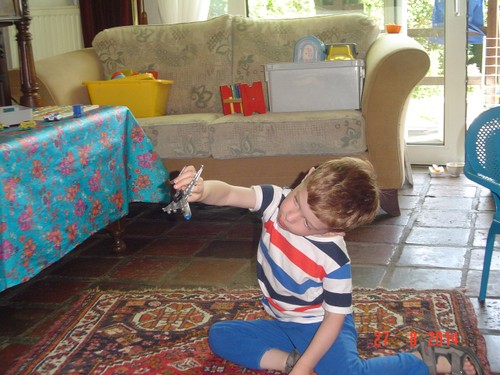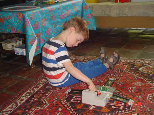 "Nu wil ik kassaatje spelen, dan heb ik appels nodig". We richten z'n winkel in en halen even wat ondermaatse appeltjes uit de tuin, gooien wat aangegeten peren in de heg en controleren de rest, misschien dat ze nog wat groeien. Binnen checkt hij eerst z'n kassa (telmachine) en dan gaat de geldkist open. Aha, daar ligt het balletjespistool in dus eerst maar wat schietoefeningen in de gang. Daarna mag ik winkelen, d.w.z. ik mag zeggen wat ik nodig heb en Bart pakt het vervolgens, 'scant' de boodschappen, stopt pas in de gleuf om te pinnen, geeft me geld en maakt een bon. "En wat heb je nu nodig", en de hele procedure opnieuw. Na een kwartier doet hij de geldkist dicht, ga je pauze houden? "Ja" en gaat spelen met treintje, auto's en vliegtuig.