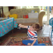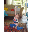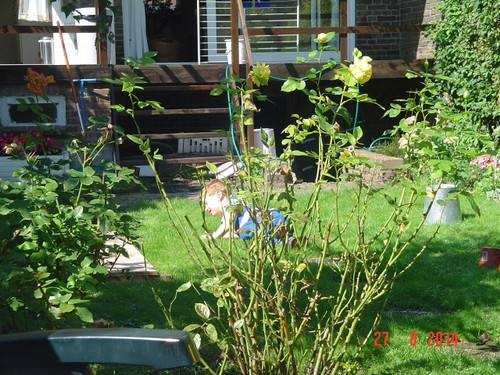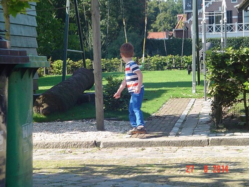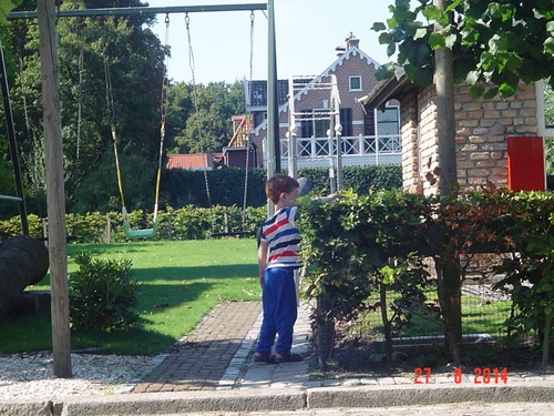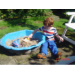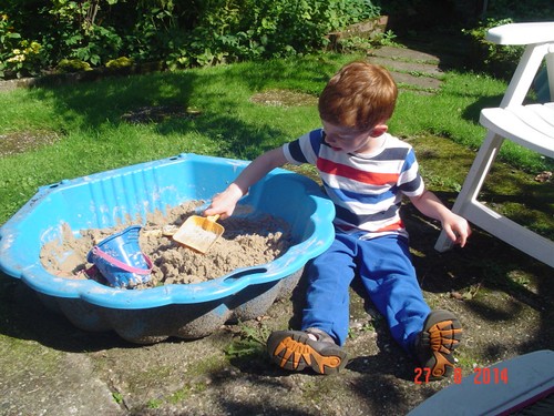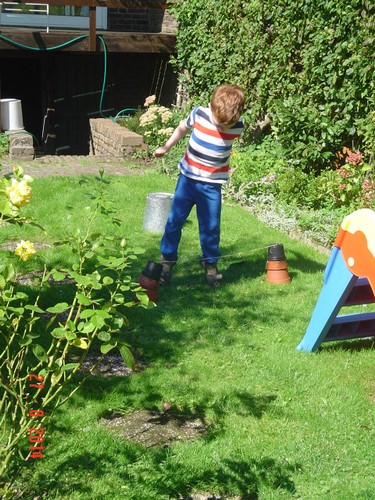 We gaan de tuin in, eerst de plank uit de kelder halen en dan hoogspringen, over de plank lopen, emmer tikken en door het gras rollen. Bart krijgt het warm, even pauze en in de zandbak verder bouwen aan z'n 'kasteel'. Graaft gaten op zoek naar een schat. Ik krijg een idee: ik haal het kleine kistje uit de kamer, stop er een zakje koekjes in en stel voor dat ik die verstop in het zand, maar dan mag hij niet kijken. O jé!!!!! Totaal verkeerd, Bart wil niet en zet het op een brullen. Wat krijgen we nou? Ben jij gek, even op schoot, en nou ophouden, nergens voor nodig!!!! Dramaqueen denk ik.
