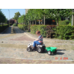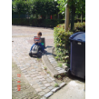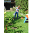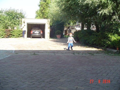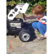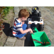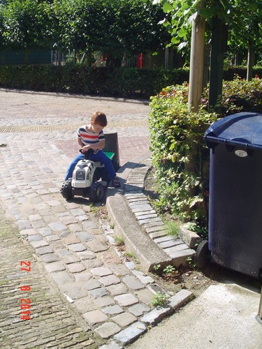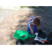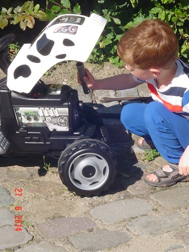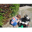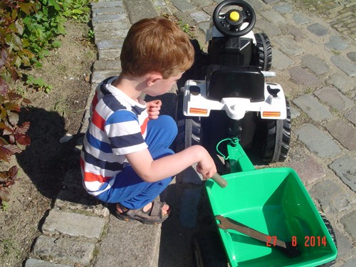 Tractor uit de kelder halen, Bart tilt de aanhanger eruit, rijdt de tractor tot de trap en dan de tuin uitrijden. Crosst heen en weer, kijkt bij de kippen en inspecteert het terrein. Uit de garage haal ik wat 'groot' gereedschap en dat stopt meneertje in z'n aanhanger. Regelmatig even parkeren en met gereedschap z'n motor repareren. De buurvrouw komt langs, "hi" zegt Bart met arm omhoog. Buurvrouw bewondert z'n voertuig en zegt dat hij best in hun tuin mag spelen met de wipkip, de glijbaan en de trampoline. Bart's respons: "ik heb ook gereedschap in mijn aanhanger". De buurvrouw vindt het stoer en ik bedank haar voor het aanbod. Bart gaat verder rijden, nu boodschappen doen voor mij bij de gamma, die ligt volgens hem bij de bielzen. Eerst bestel ik lange latten, dan schroeven, een wc-bril, een wc pot, zaagjes. Even later komt het buurmeisje op een roze fiets haar tuin uit. Rijdt heen en weer, Bart roept iedere keer "hi" met opgeheven arm als ze voorbijkomt terwijl hij bezig is met z'n boodschappen. Dan stopt ze bij mij en kijkt verbaasd naar Bart's activiteiten, ik leg uit dat Bart inkopen doet bij de gamma. Ze glimlacht liefjes maar begrijpt het niet helemaal. Bart komt terug met de 'wc-pot' sjouwt hem uit z'n aanhanger en zet hem naast de heg, tegen het meisje: "zie je hoe groot ik draag? kijk ik heb ook schroeven", meisje stapt van haar roze fietsje af en kijkt me vragend aan, ik lach liefjes terug. Bart gaat bij haar staan en begint een gesprek: "ik heb ook gereedschap in mijn aanhanger, zie je dat?, . . . hek is dicht", ja dat heeft mijn moeder gedaan omdat we hier fietsen, Bart kletst verder, ik kan het niet verstaan, meisje antwoordt aarzelend. Dan komt Bart weer bij mij terug om de volgende bestelling op te nemen, meisje vraagt mij: wat gaat hij doen? Boodschappen bij de gamma, antwoord: ik ga ook boodschappen doen en klimt weer op haar fiets, waar ga jij dat doen? Ook bij de gamma en ze fietst Bart achterna. Samen parkeren ze bij de bielzen, Bart laadt z'n denkbeeldige spullen in en samen komen ze weer terug.