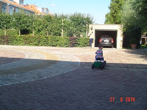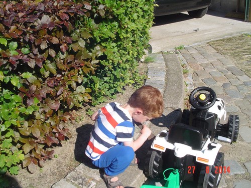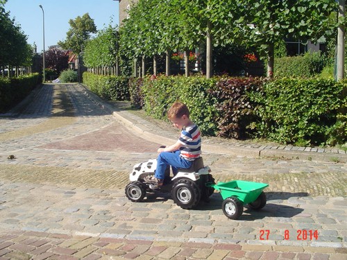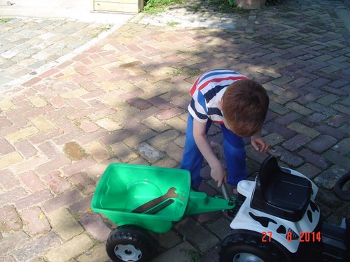 Even binnen afkoelen met mandarijn en koekjes en samen even kletsen op de bank. Dan: "ik wil eigenlijk even niet naar buiten", dus gaat hij spelen met treinbaantje en auto's. Samen leggen we even de stratenpuzzel in elkaar, Bart speelt er een tijdje mee. Eigenlijk is het veel te mooi weer voor binnen dus ik stel voor om met de tractor te gaan rijden. Zijne majesteit stemt toe.