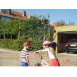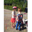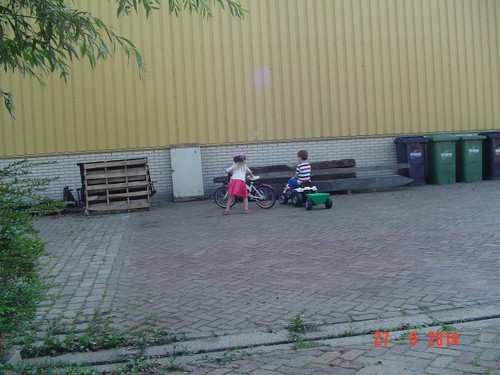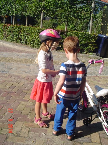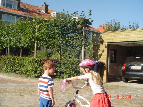 Dan wordt ze geroepen om te eten en gelijk komt papa aanfietsen. Even in de tuin, opruimen en dan op de fiets naar huis.