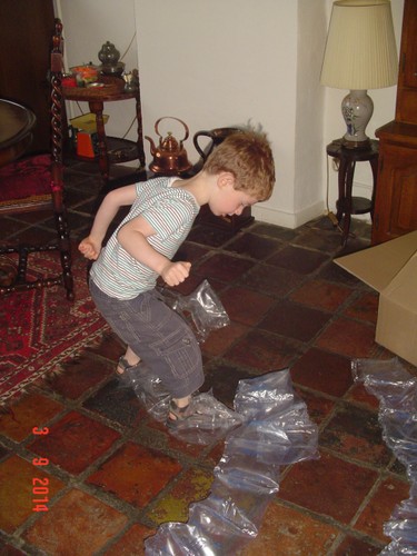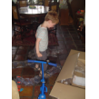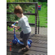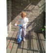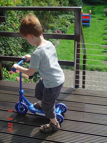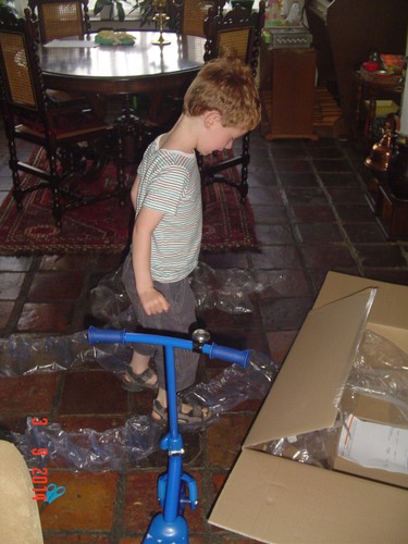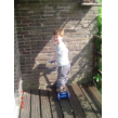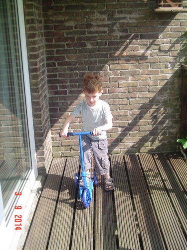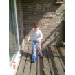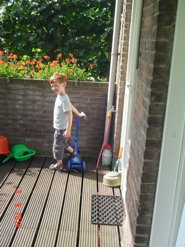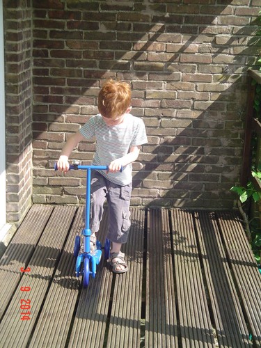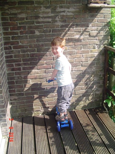 Thuis op balkon kijkt hij op de thermometer: "het is 3 minuten warm". Binnen eerst doos uitpakken: "een step!! een step!!" Ik zet het ding in elkaar terwijl Bart het plastic laat ploppen. Dan gaat hij glunderend oefenen op het balkon: "ik kan het zelf . . ik val niet om, zie je dat oma? . . . zie je dat oma? . . . hoor je de bel?" Grijns-grijns-grijns.