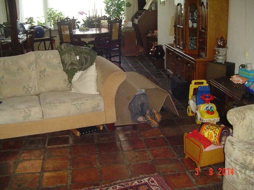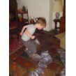 Sap drinken en chocokoekjes eten, daarna tegen me aangeleund MM kijken en "nou wil ik kikker kijken, da's een goed idee hè?" Vooruit maar. Daarna speelt hij nog even met de doos: "kijk-es oma!!!".