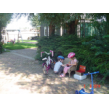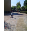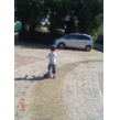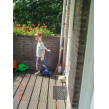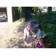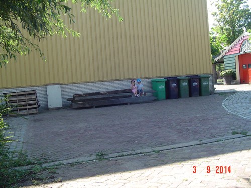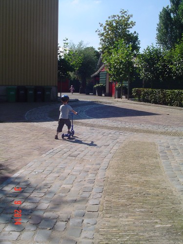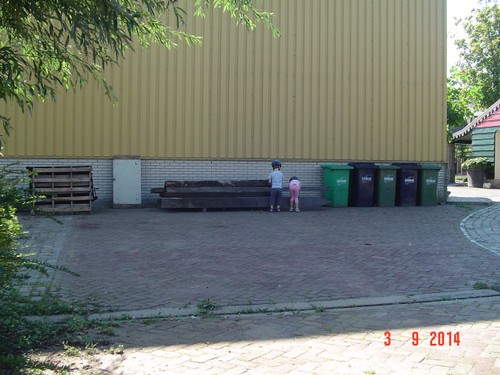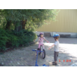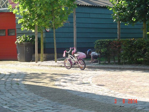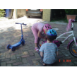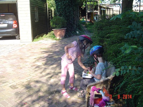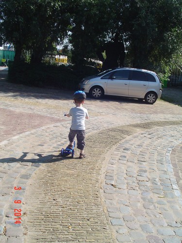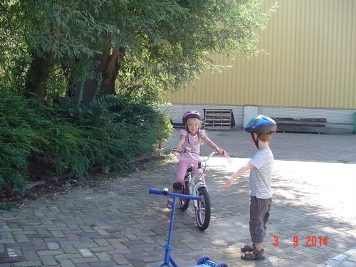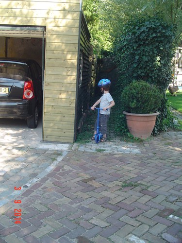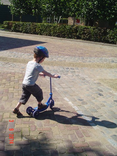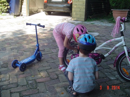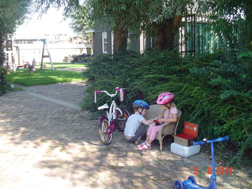 Naar buiten met step en helm op, al gauw komt Senne zeggen dat ze ook haar fiets pakt. Samen heen en weer, dan winkeltje spelen. Senne haalt haar kassa (vindt Bart prachtig) en ik haal Bart's 'geheime' geldkist (vindt Senne prachtig). Spelen samen, soms mot over wie welke kassa mag bedienen maar Bart geeft geen krimp. Ook nog even samen stoepkrijten en dan gaan ze weer het terrein over. Af en toe uit het zicht en dan loop ik er onmiddellijk achteraan.
