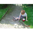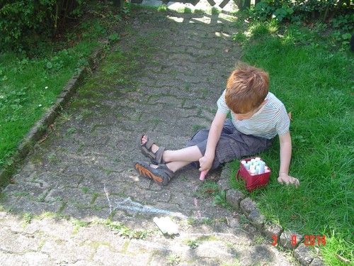 "Dat is stoepkrijt . . even uitpakken . . nou wil ik in de tuin even met stoepkrijt (ook even op glijbaan - maar al gauw te warm) kom je mee onder het zonnescherm?"