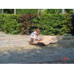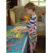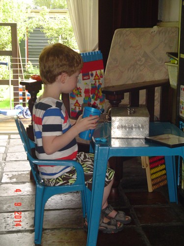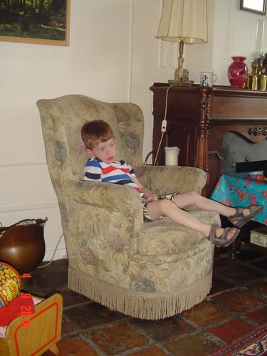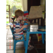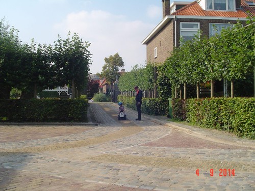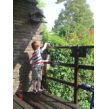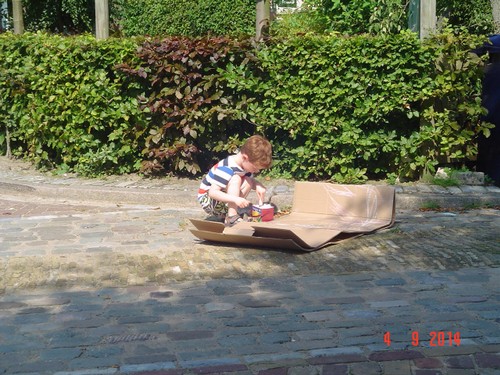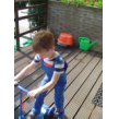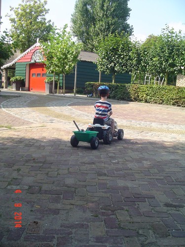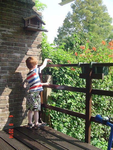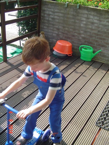 Naar de zolder met lego spelen, na een uurtje naar beneden voor sap en koekjes, gaat dan een tijdje: "bonnetjes maken . . kijk-es hoe klein ik knip?" Toch weer even op balkon steppen en met de bel rinkelen. Al gauw komt er gebel terug van de achterburen en even later staat Senne bij het hek: Kom je buiten spelen? Bart is niet te houden, samen rijden ze heen en weer. Helaas, na 10 min. moet Senne mee boodschappen doen en dan wil Bart niks meer, wil je nog rijden? "weet ik niet (met stoepkrijt?) weet ik niet", baasje leunt tegen me aan, voelt plakkerig, is niet fit. Hele boel weer opruimen, maar bij het hek vertikt Bart de tractor naar binnen te rijden: "is te zwaar" en ramt het ding heen en weer. Dan heb ik er genoeg van, ophouden en nu naar binnen! Daar gaat meneertje verongelijkt in een stoel zitten: "ik wil niet spelen". Ik laat hem maar even betijen en ga de geraniums doen. Daarna zet ik 'kikker en de vreemdeling' op en kijken we samen op de bank.