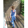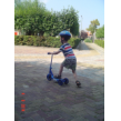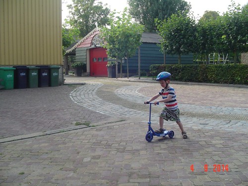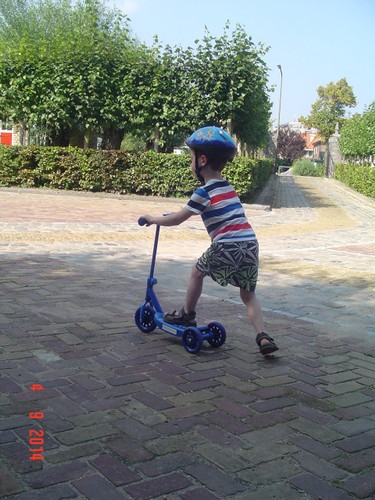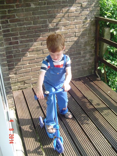 Weer het gewone tumult als ik langs het raam loop, Bart stormt naar de gang maar de juf wil dat hij eerst nog moet plassen voordat hij meegaat. Baas kijkt sip maar gaat toch met de juf mee. Onderweg in de auto: "als ik een motorfiets zie, zeg ik het tegen jou . . . is Senne naar school? . . komt ze nog terug? (ja maar wel later vanmiddag, hoezo?) ik wou met de tractor rijden (dat kun je toch ook alleen?) ja maar ik wou graag samen . . . racefietser, zag je die? ging heel hard . . . ". Thuis eerst steppen, boekje lezen, bibbeltje big kijken, sap drinken, mandarijn eten. Korte broek aan: "is warm hè?"