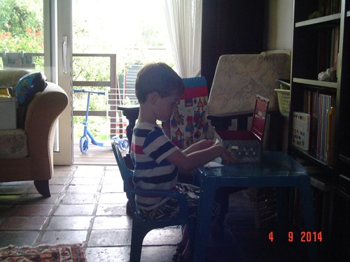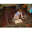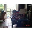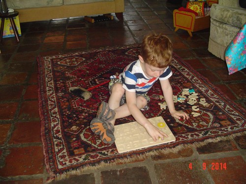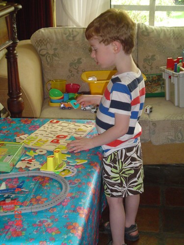Naar buiten met de tractor en step, even rijden, kippen kijken, stoepkrijt, maar de lol is er na een ½ uurtje af: "eigenlijk wil ik nu even naar binnen". Speelt dan een hele tijd met de letterpuzzel: "wel knap dat ik dat deed hè? . . zal ik die nog een keer maken? . . knap hè?".