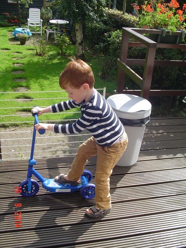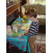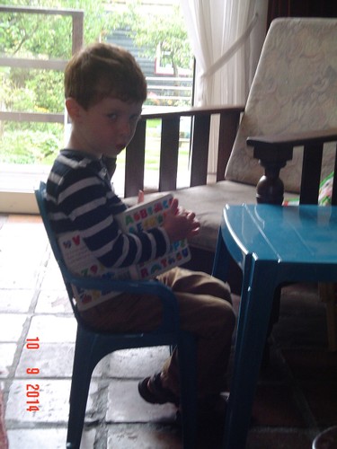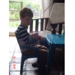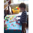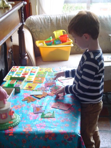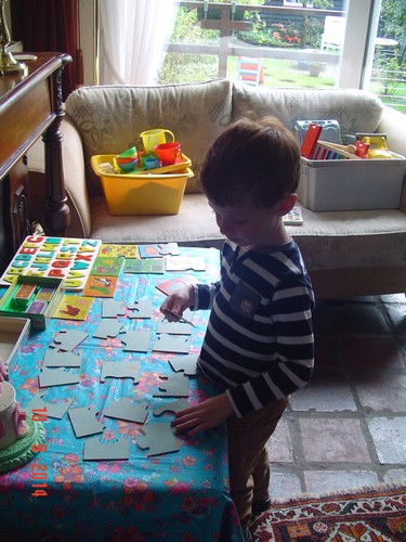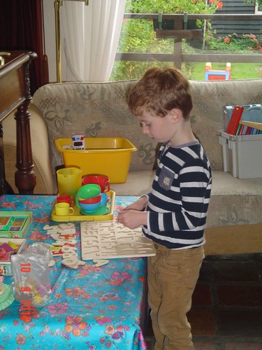 Daarna is hij een hele tijd bezig met z'n letterpuzzel en kletst ondertussen: "klaar, zie je dat? zal ik hem nog een keer maken? . . wuh van Wart . . Wart is al naar school . we missen hem heel erg . . Linda mist ons ook heel erg . . misschien komt ze een keertje langs . . dat zou leuk zijn hè? . . misschien is ze in Noordwijk aan de slag, ik weet het niet . . misschien is ze met pes-sioen". Tijd voor mandarijn en sap, verder met lezen letterboekje. Ontdekt een andere puzzel, weer een hele tijd mee bezig, hij maakt het zichzelf extra moeilijk door de stukjes om te draaien. Zo kan je het toch niet zien? Kun je hem dan nog maken? "Ja hoor . . kijk maar . . knap hè? zal ik het nog een keer doen?" Ik sta paf!
