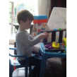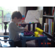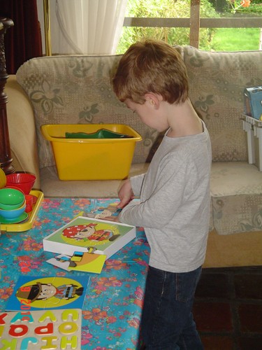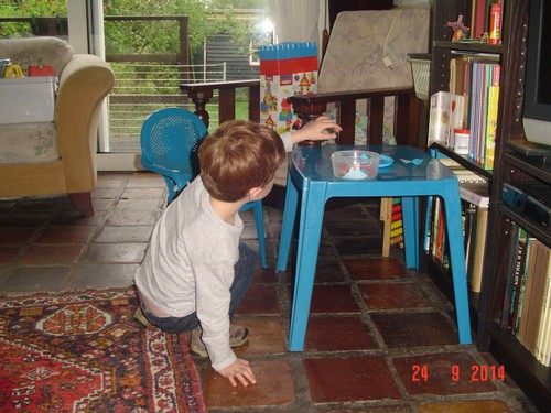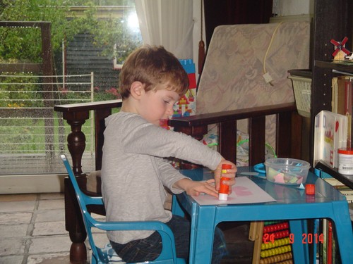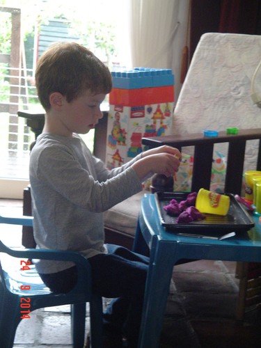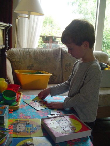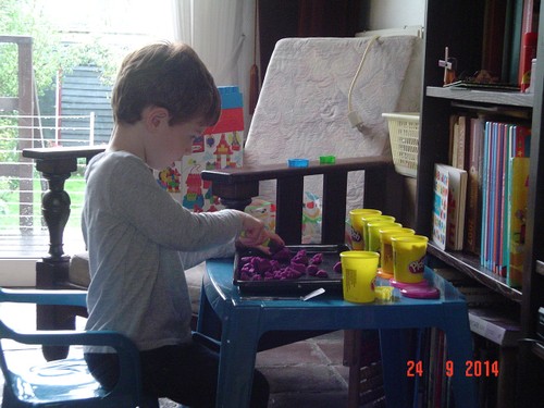 Door de regen gaan we even een boodschapje doen bij de grote hoogvliet, daarna weer skippiën, puzzels maken en kleien. Ik maak een afspraak met hem: geen bui als papa jou komt halen, je doet gewoon, afgesproken? "Oké".