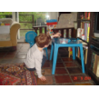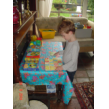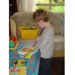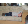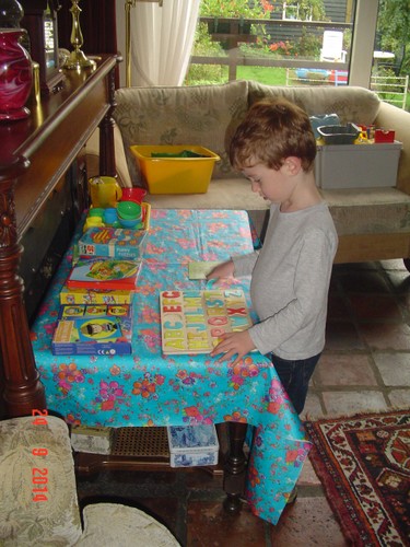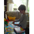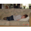 Boek uit, nu moet je even zelf spelen Bart. Maar de energie is blijkbaar op en baasje dwaalt een beetje doelloos door de kamer. Je kunt een puzzel maken of even in je kast kijken. Bart doet z'n kast open en weer dicht: "ik weet het niet", nou bedenk maar even wat je wilt gaan doen en ik ga op de bank even wat opschrijven voor het dagboek. Even later kijk ik om en dan zit Bart op het kleed bij de tafel, wat doe je nou? weet je het nog niet? vind je het leuk om daar te zitten? Baas knikt, goed hoor en ik ga in de keuken de poezemand verschonen. Als ik terugkom, is hij erbij gaan liggen, op z'n rug, knieën opgetrokken en over elkaar, handen achter z'n hoofd. Wat doe je nou? Ben je zo moe? Bart knikt. Dan kun je veel beter even op de bank liggen, kom maar, dan gaan we even kikker kijken, "maar niet van de brand hè?", nee natuurlijk niet. Hij installeert zich op de bank, legt kussen onder z'n hoofd en lacht mee met kikker, konijn, eend en varken. Ligt daarna nog even wat te draaien en te geeuwen maar is na 5 min. vertrokken.