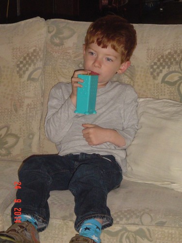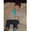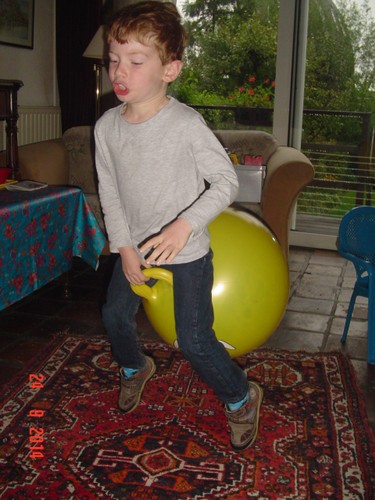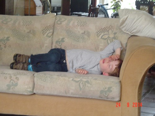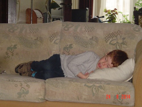 Wakker maken, zit 5 min. tegen me aan bij te komen, dan halen we sap en 2 mandarijnen in de keuken. Daar knapt hij helemaal van op, heeft weer energie en gaat skippiën: "kijk-es hoe hoog, zag je dat? net als goofy, ik kan het al goed hè?"