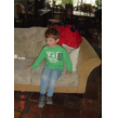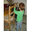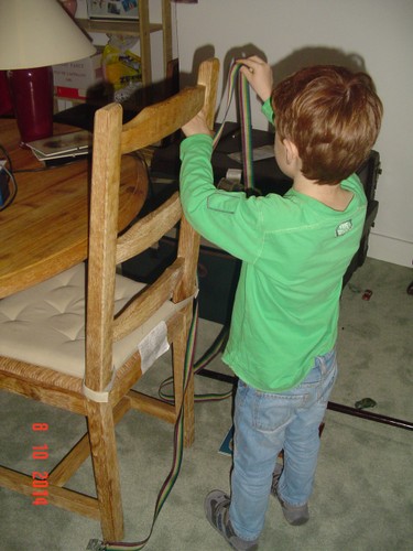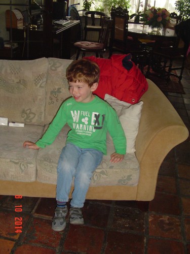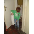 Beneden even druifjes eten, rustig zitten als je eet Bart!! Noppes, hij blijft heen en weer stuiteren dus verslikt hij zich en hoest met tranen over z'n wangen. Tja dat komt ervan, nu eet hij rustig op de bank z'n bakje leeg. Met vuilniszak weer naar boven en alles in de zak gooien, ik ga verder met de kasten en Bart speelt met de spanbanden: "ik maak de stoelen vast . . . tegen de dieven".