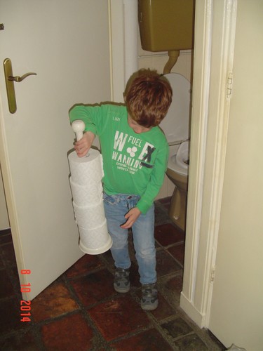 Door de stromende regen naar de auto. Onderweg babbelt Bart honderduit maar ik kan hem niet verstaan omdat de regen op de auto klettert. Eenmaal thuis is hij stuiterig: springt steeds op de bank en rolt over het kleed. Spongebob-koekjes kalmeren hem en we zitten even rustig te kletsen. Yogho ook op dus: waar wil je mee spelen? "Ik weet het nog even niet", ga maar wat bedenken dan doe ik ondertussen de post en ik pak de stapel, Bart drentelt wat heen en weer en komt weer bij me staan: "da's een gammakrantje, heb ik thuis ook . . . da's een buh . . . is dat?" Stapel weggewerkt: weet je al waar je mee gaat spelen? "nee ik weet het nog niet". Zoek gewoon maar iets uit, ik moet nu even deze papieren nakijken aan m'n bureau. Bart blijft drentelen en komt steeds naast me staan: "ben je aan het doen?", rekeningen controleren, dus nu even stil zijn, Bart drentelt weer weg, komt weer terug, "ben je al klaar?". Sssst! Even zelf iets doen baas, straks gaan we boven opruimen en dingen weggooien, "eigenlijk weet ik het even niet", kijk maar even in je kast. Bart gaat op de bank zitten koekeloeren, na een paar minuten ben ik klaar. Ben je moe? wil je even liggen? "Nee hoor!" Wil je kikker kijken? "jaaa maar dan ga ik wel zitten". We kijken een kwartiertje, "nou moet ik plassen . . . die zijn weer op (toiletrollen) zal ik die even pakken?" Bart haalt het pak uit de keuken en vult bij. Even een boekje lezen, Bart nog steeds niet moe, ga maar even een puzzel maken. In no time de puzzel af: "nou ben ik klaar, gaan we nu naar boven?"