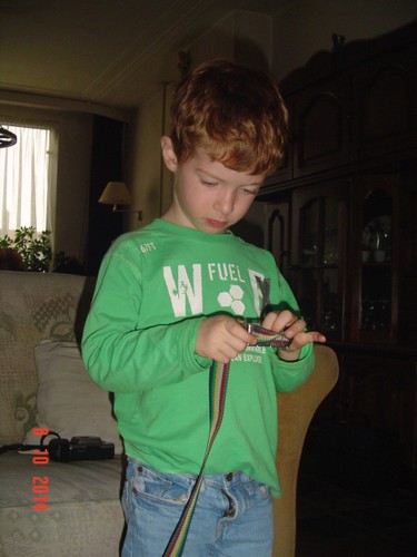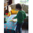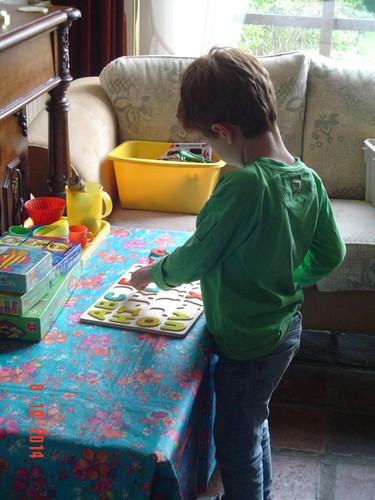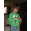 Genoeg geruimd, naar beneden, mandarijn eten en spelen met z'n 'banden', zingt ondertussen mee met de cd: "dat is mijn oude muziek . . ken je dit? . . . heb ik thuis ook". Dan komt hij weer naast me zitten, wil je nog even een puzzel maken? "ik weet het niet" of anders pak je je gereedschap, "misschien . . ik weet het nog niet . . ik wil straks even muziek maken" en gaat een tijdje door met spanbanden. Komt weer naast me zitten, wil je nu muziek maken? "als het droog is, dan wil ik muziek maken".