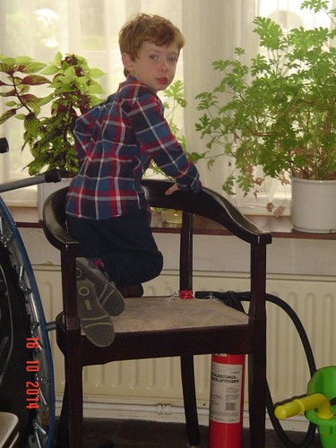 Thuis, direct een pufje en sinaspril, op de bank zitten, uitdeeltasje open en spelen met de spulletjes. "Hoor ik?" da's de tuinman die de klimop weghaalt. Baas wil natuurlijk direct zien wat er gebeurt en klimt op een stoel om naar buiten te kijken. Nog even zitten kletsen en na een ½ uurtje heeft hij weer genoeg lucht om even op de roltong uit het tasje te blazen, maar houdt er al gauw mee op, gaat weer piepen. Daarna timmeren en steeds tuinman kijken, krijgt het weer benauwd.