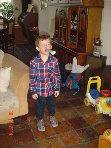 We kijken nog een MM, halverwege: "ik moet plassen als het afgelopen is". Nee, doe nu maar, dan zet ik MM op pauze. Bart krijgt een woede-aanval maar we zetten door, gewoon even plassen, niet zo gek doen! Daarna MM afkijken, zie je nou wel? je hebt niks gemist, Bart is weer rustig. Nog even kletsen en om 16.45 met mama in de auto naar huis.